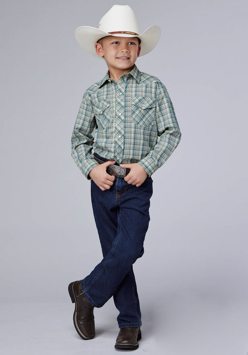 Roper Kids Boys 2075 Plaid Cream/Teal Cotton Blend L/S Shirt