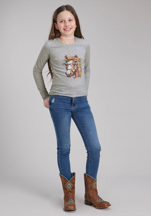 Roper Kids Girls Flower Horse Grey Cotton Blend L/S T-Shirt