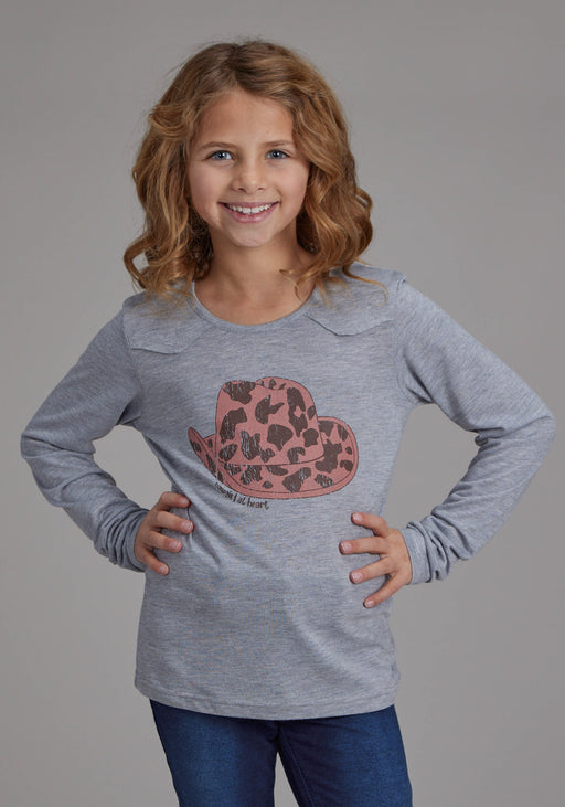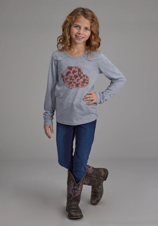 Roper Kids Girls Cowboy Hat Heart Grey Poly/Rayon L/S T-Shirt