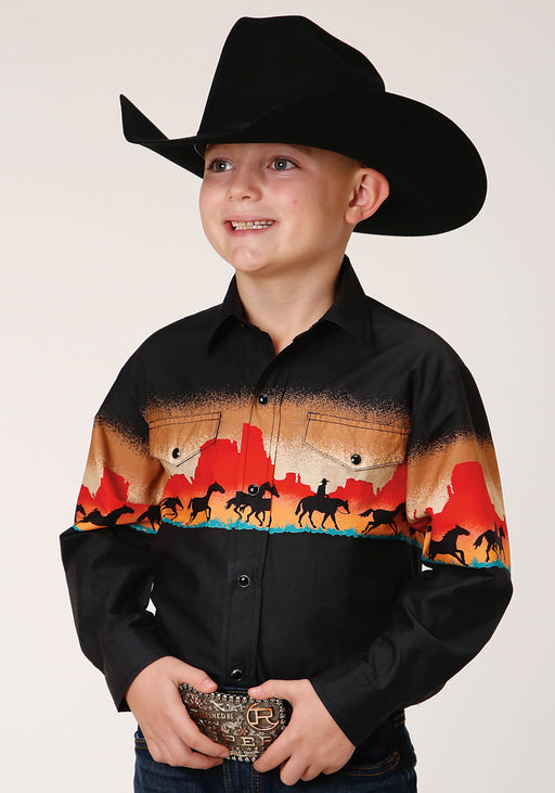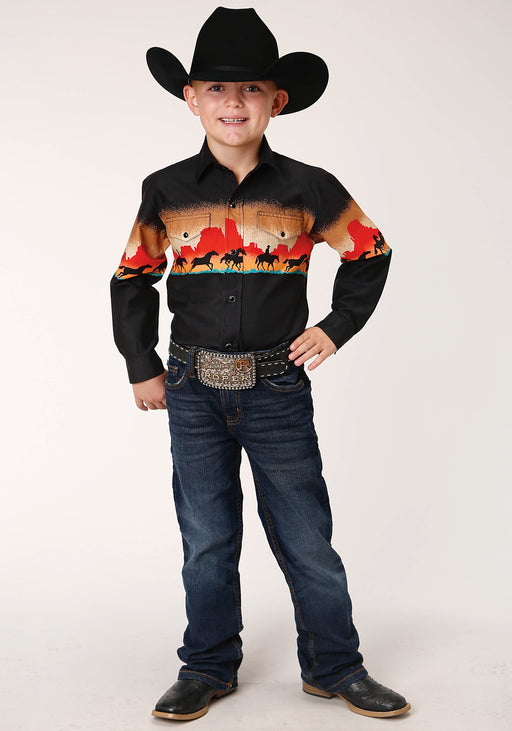 Roper Boys Kids Black 100% Cotton Red Mesa Scenic L/S Shirt