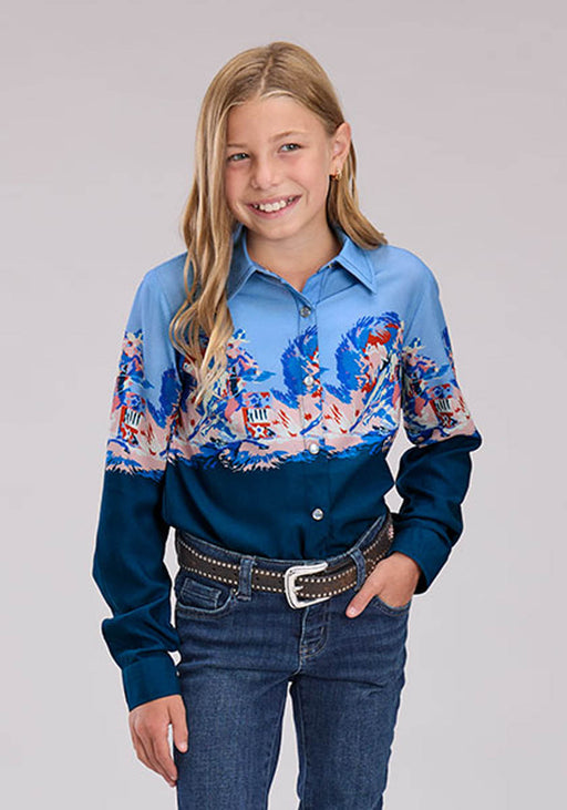 Roper Kids Girls Barrel Racer Border Blue 100% Rayon L/S Shirt