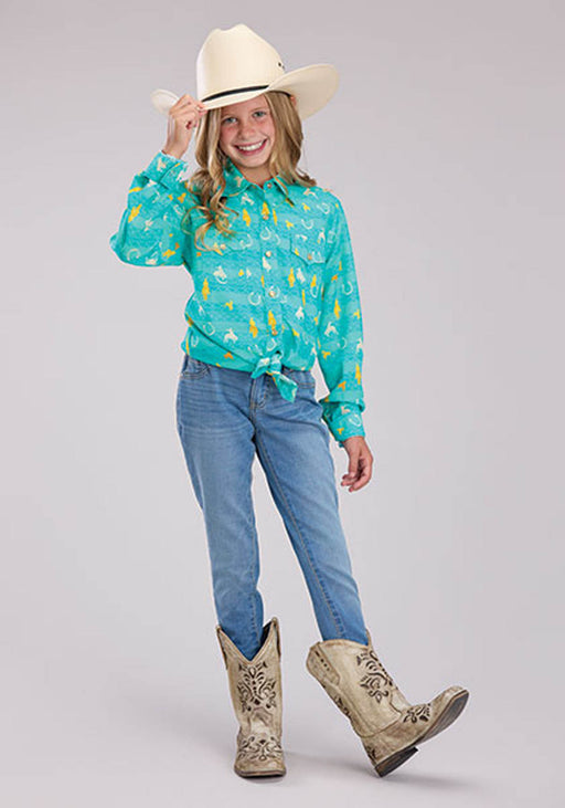 Roper Kids Girls 2525 Vintage Aztec Turquoise 100% Rayon L/S Shirt