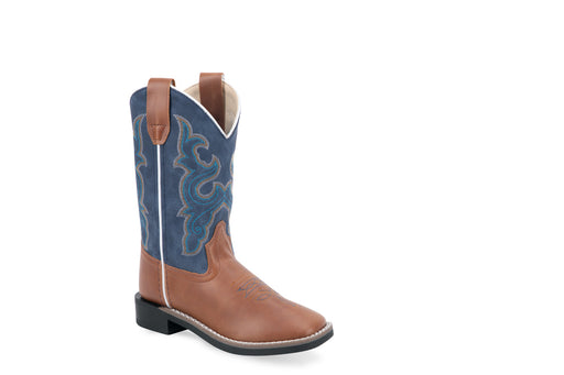 Old West Kids Unisex Broad Square Toe Tan/Blue Faux Leather Cowboy Boots