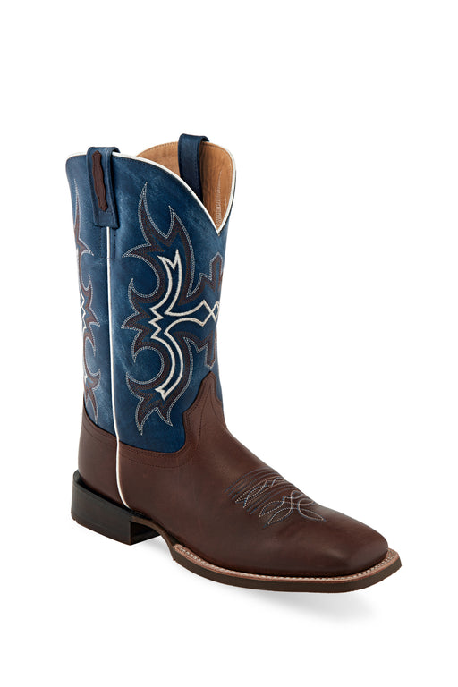 Old West Mens Broad Square Toe Dark Brown/Wipe Out Blue Leather Cowboy Boots