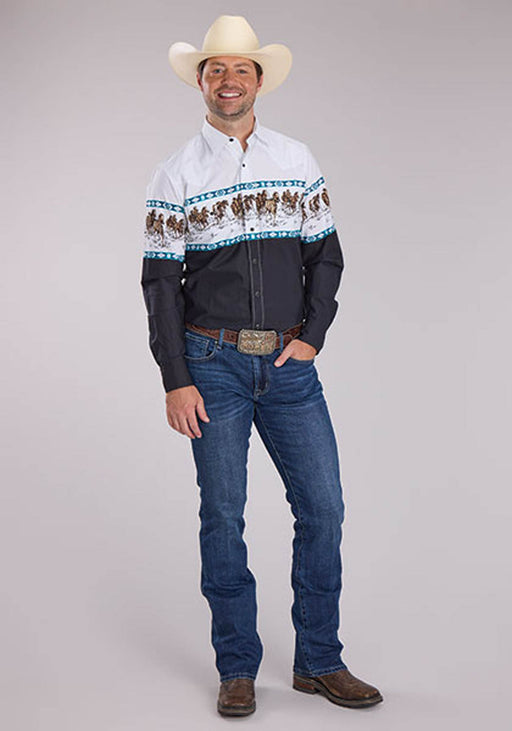 Roper Mens Running Horse Border Black 100% Cotton L/S Shirt