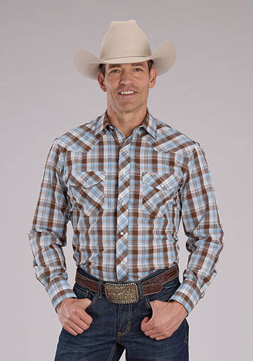Roper Mens 2483 Western Plaid Cocoa/Sky Blue Cotton Blend L/S Shirt