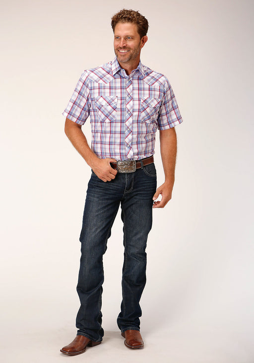 Roper Mens Berry Plaid White Cotton Blend S/S Shirt