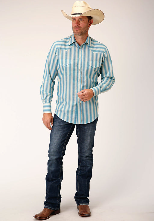 Roper Mens 55/45 Ombre Stripe Aqua/Cream Cotton Blend L/S Shirt