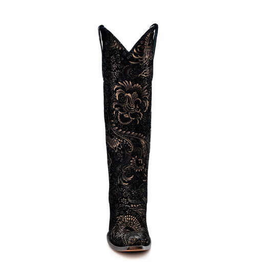 Corral Womens Gold Stamped Floral Snip Toe Black Cowhide 16in Cowboy Boots