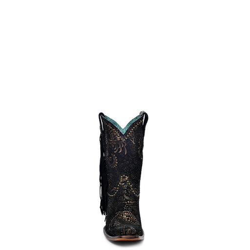 Corral Womens Gold Stamped Fringe Square Toe Black Cowhide 9.5in Ankle Boots