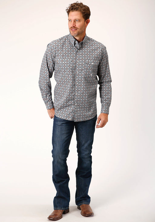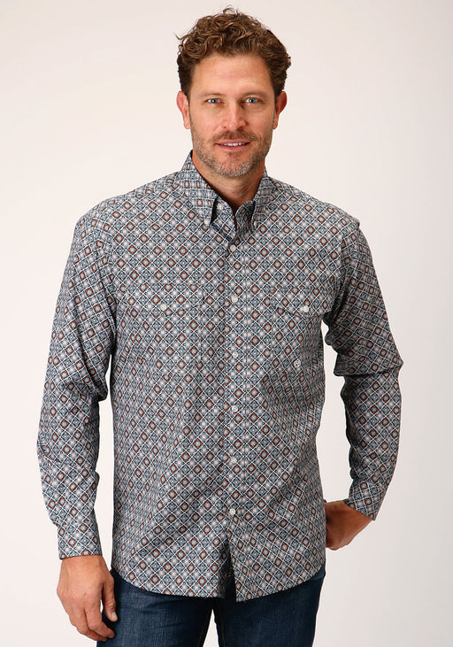 Roper Mens Blue Cotton Blend Diamond Star Geo BD L/S Btn Shirt