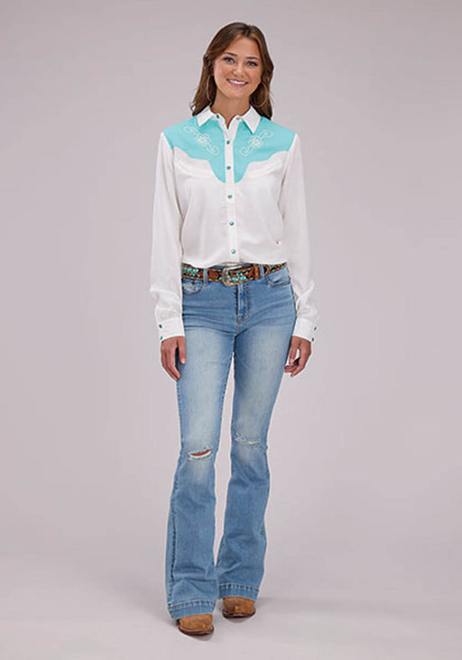 Roper Womens Curvy Fancy Yokes Cream/Blue 100% Rayon L/S Shirt