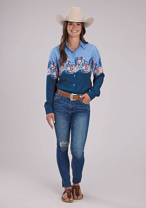 Roper Womens Barrel Racer Border Blue 100% Rayon L/S Blouse