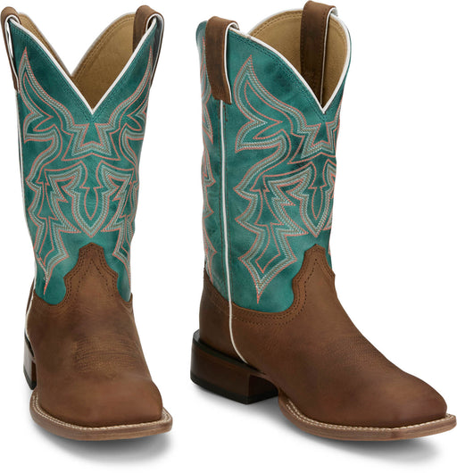 Justin Womens Shay 11in Western Tan/Turquoise Leather Bent Rail Cowboy Boots