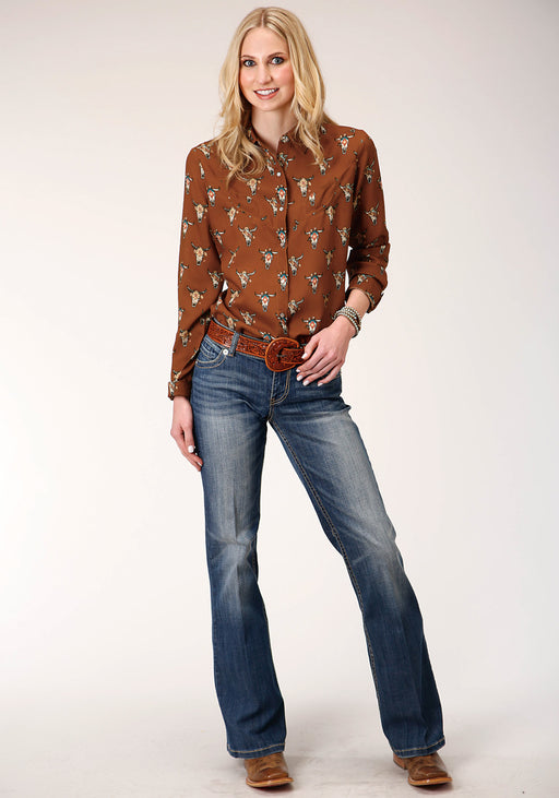 Roper Womens Brown Rayon/Nylon Cow Skulls L/S Blouse