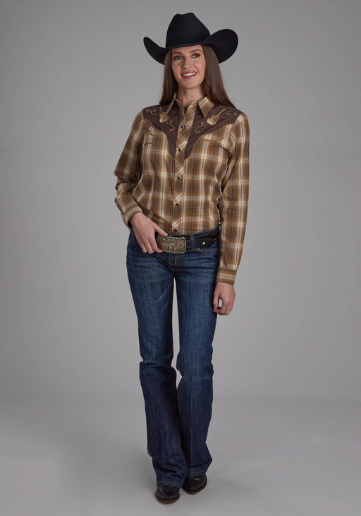 Roper Womens 2107 Plaid Yoke Tobacco/Red Cotton Blend L/S Shirt