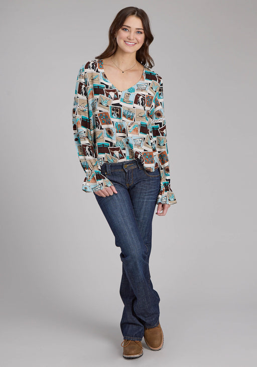 Roper Womens Photo Collage V-Neck Multi-Color 100% Rayon L/S Blouse