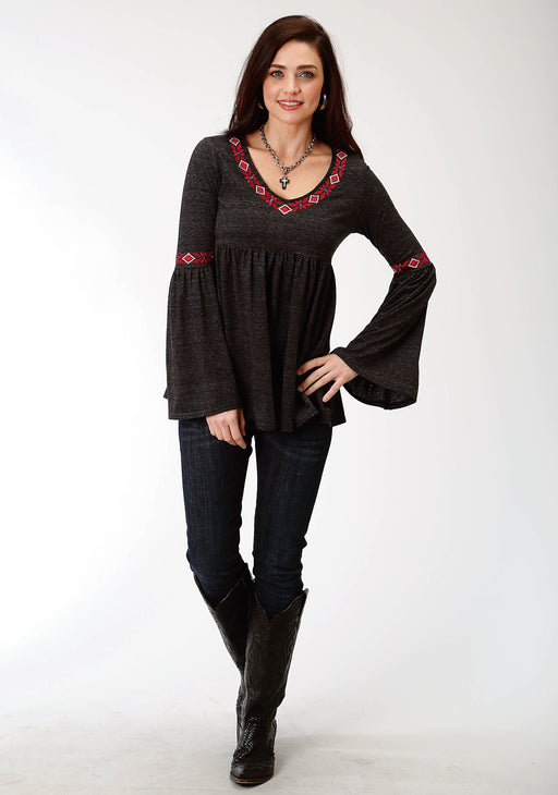 Roper Womens Heather Black Poly/Cotton Floral Crewel L/S Tunic