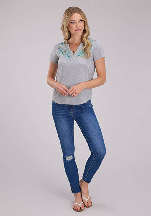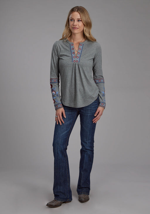 Roper Womens Banded Collar Embroidery Grey Poly/Cotton S/S Tunic