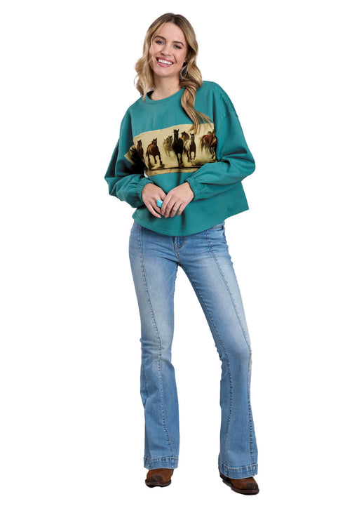 • Roper Womens 2633 Running Horses Teal 100% Cotton Sweatshirt